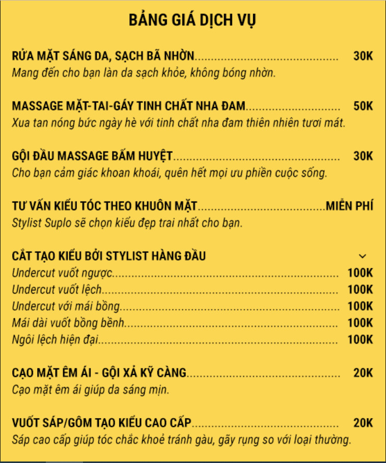 Salon cung cấp một loạt các dịch vụ từ cắt, nhuộm, uốn, duỗi tới các liệu pháp chăm sóc tóc chuyên sâu. Với sự đầu tư về thiết bị và sản phẩm, [THUONGHIEU] cam kết mang đến cho khách hàng những dịch vụ tốt nhất.